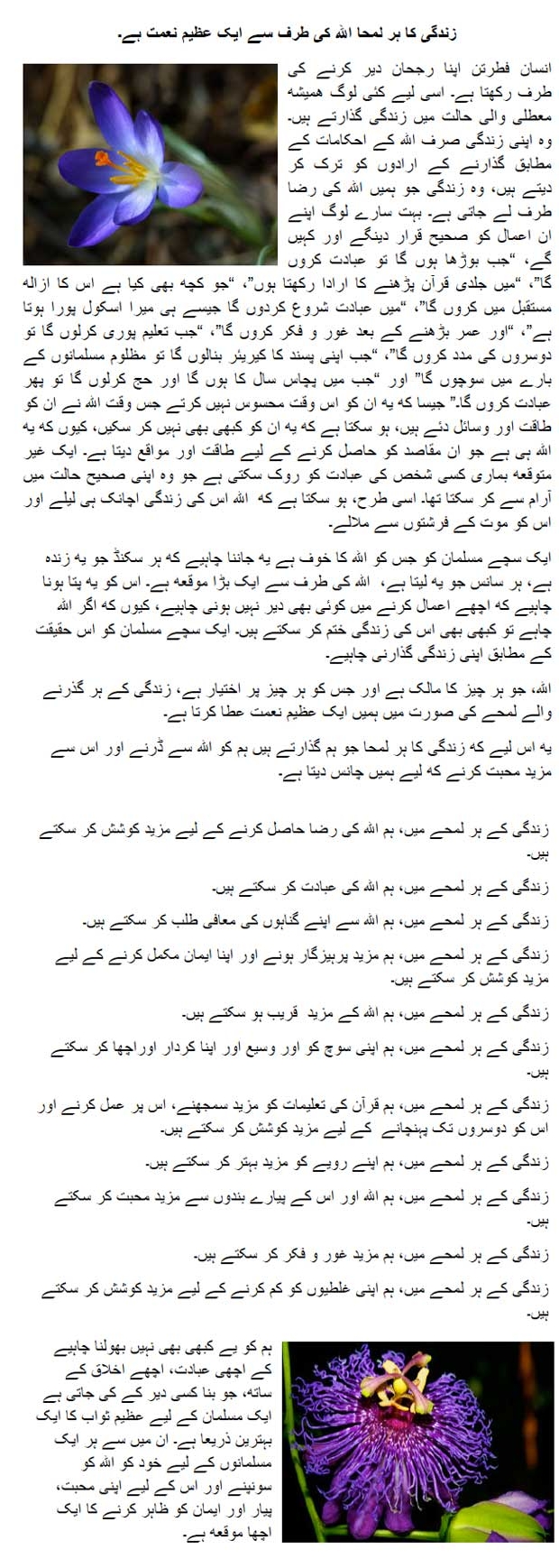 ایک سچے مسلمان کو جس کو اللہ کا خوف ہے یہ جانناچاہیے کہ ہر سیکنڈ جو یہ زندہ ہے، ہر سانس جو یہ لیتا ہے، اللہ کی طرف سے ایک بڑا موقعہ ہے۔ اس کو یہ پتا ہونا چاہیے کہ اچھے اعمال کرنے میں کوئی بھی دیر نہیں ہونی چاہئے، کیونکہ اگر اللہ چاہے تو کبھی بھی اس کی زندگی ختم کر سکتے ہیں۔ ایک سچے مسلمان کو اس حقیقت کے مطابق اپنی زندگی گذارنی چاہیے