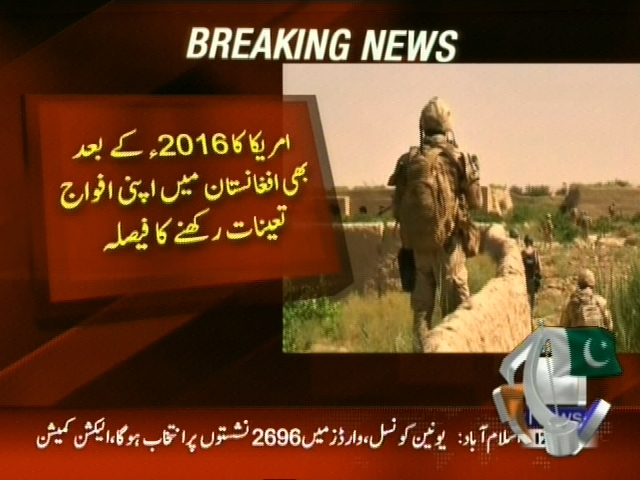 امریکہ کا 2016 کے بعد بھی افغانستان میں اپنی افواج تعینات رکھنے کا فیصلہ، منصوبے کا اعلان امریکی صدر بارک اوباما کریں گے، اوباما 2017 میں صدرات چھوڑیں گے تو اس وقت بھی ساڑھے پانچ ہزار امریکی فوجی تعینات ہوں گے۔