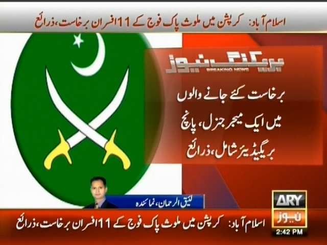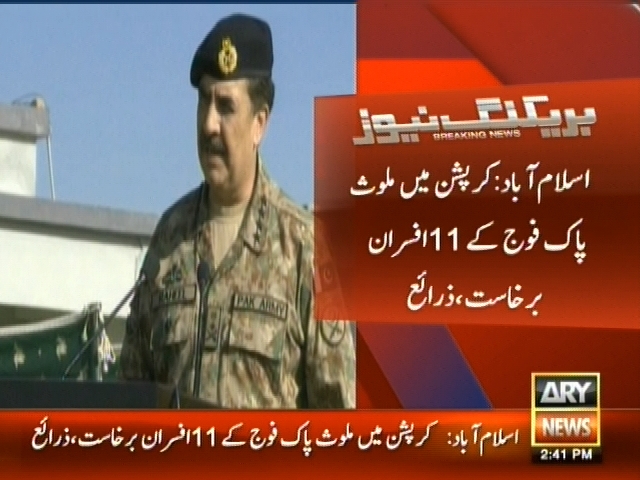 فوج میں بھی احتساب کا عمل شروع، اسلام آباد، کرپشن میں ملوث پاک فوج کے 11 افسران برخاست، برخاست کئے جانے والوں میں ایک میجر جنرل، پانچ بریگیڈیئر شامل، دیگر میں ایک کرنل، تین لیفٹیننٹ کرنل، ایک میجر شامل ہے، ذرائع۔
