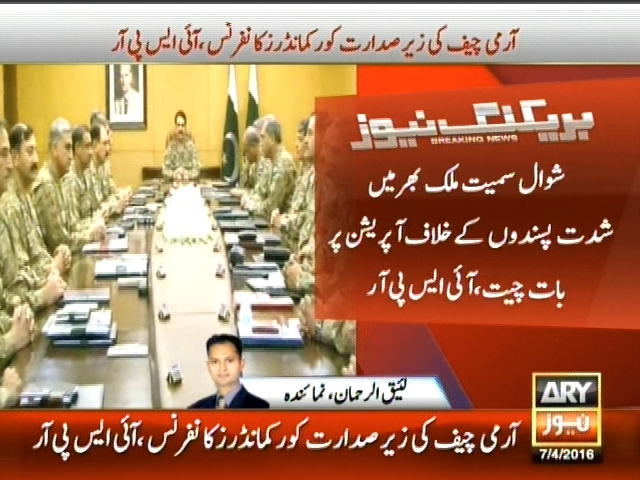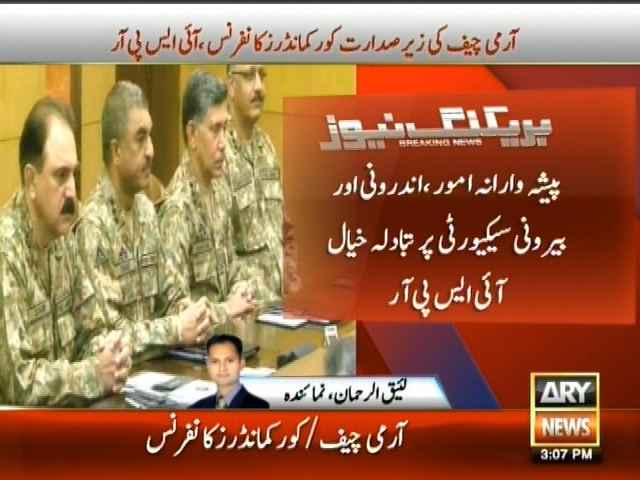آرمی چیف کی زیر صدارت کورکمانڈرز کانفرنس، پیشہ وارانہ امور، اندرونی اور بیرونی سیکیورٹی پر تبادلہ خیال، شوال سمیت ملک بھر میں شدت پسندوں کے خلاف آپریشن پر بات چیت، آئی ایس پی آر۔