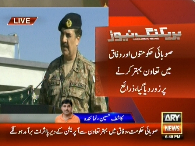 آرمی چیف نے کہا کہ سیکورٹی صورتحال دوبارہ خراب نہیں ہونے دینگے، آرمی چیف نے کہا کراچی آپریشن غیر سیاسی اور جرائم پیشہ افراد کے خلاف ہے، صوبائی حکومتوں اور وفاق میں تعاون بہتر کرنے پر زور دیا گیا، ذرائع۔