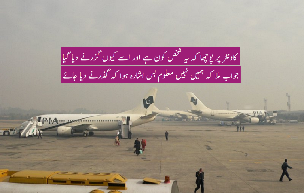 یوں تو اسلام آباد ائر پورٹ پر باہر سے اندر جانے والوں کی سختی سے چیکنگ ہوتی ہے اور مسافر کے علاوہ صرفایک بندے کو اندر جانے کی اجازت ہوتی ہےاب یہ تو حفاظتی انتظامات اندر جانے کے لیے کئے جاتے ہیں لیکن اندر جوایسے عناصر موجود ہیں ان کی جانچ پڑتال کیوں نہیں کی جاتی یہ ایک اہم نکتہ ہے چھبیس مارچ فرانس سے جانے والی پی آئی اے کی فلائٹ جب اسلام آباد پہنچی تو مسافر امیگریشن کے مراحل سے گزرنے کے لیے لائن میں کھڑے ہوگئے کیونکہ امیگریشن کاونٹر پر تصویر بنانی ہوتی ہے اس لیے وقت ذیادہ لگتا ہےاس لمبی قطار کی پروا نا کرتے ہوئے ایک شخص کو اس وقت ائیر پورٹ پر موجود ائیر پورٹ محکمہ اور پی آئی اے کے عملے کے سامنے بنا تصویروی پی آئی پروٹو کول کے چکر میں گزرنے دیا گیا