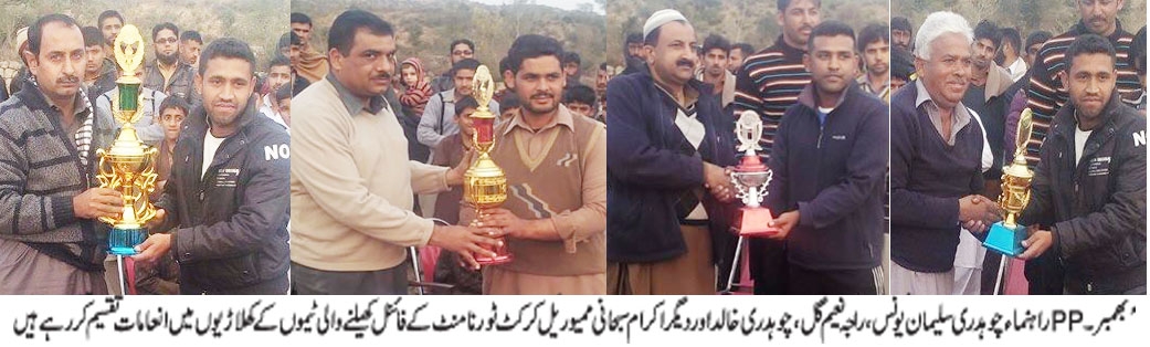 بھمبر ( ڈسٹرکٹ رپورٹر ) ٹھیکیدار اکرام سبحانی مرحوم انسان دوست شفیق مہربان اور غریب پرور انسان تھے علاقے کیلئے ان کی گراں قدر سیاسی و سماجی خدمات ہیں صحت مند معاشرے کیلئے کھیلوں کا فروغ نا گزیر ہے ان خیالات کا اظہار پاکستان پیپلز پارٹی کے راہنما چوہدری سلیمان یونس درائیاں نے کانگڑہ میں اکرام سبحانی میموریل کرکٹ ٹورنامنٹ کے فائنل میچ کی افتتاحی تقریب سے بطور مہمان خصوصی خطاب کرتے ہوئے کیا انہوں نے کہا کہ ٹھیکیدار اکرام سبحانی مرحوم اچھا انسان دوست تھا جس نے کم عمری میں ہی بڑا نام کمایا مختصر سی زندگی میں علاقے کی تعمیر و ترقی اور لوگوں کی فلاح و بہبود کیلئے اپنا سیاسی و سماجی بھر پور کردار ادا کیا مرحوم کی یاد میں کرکٹ ٹورنامنٹ کا انعقاد کر کے نوجوانوں نے ان سے اپنی محبت کا اظہار کیا جس پر انہیں خراج تحسین پیش کرتا ہوں انہوں نے کہا کہ صحت مندانہ سر گرمیاں صحت مند معاشرے کے قیام کے فروغ میںاہم کردار ادا کرتی ہیں تعلیم و تربیت کے ساتھ ساتھ کھیل بھی ضروری ہے انسان کو تندرست رہنے کیلئے کھیل کے میدان کو آباد کرنا پڑتا ہے اور وہیں ملک کے کھیل کے میدان آباد ہوتے ہیں وہاں کے ہسپتال ویران ہوتے ہیں کھیل میں ہار اور جیت سے انسان میں برداشت اور صبر کا حوصلہ پیدا ہوتا ہے ہمیں نوجوانوں کو صحت مندانہ سرگرمیوں کی طرف راغب کرنے کیلئے ان کے ساتھ تعاون کرنا ہو گا انہوں نے ٹورنامنٹ کمیٹی کیلئے 15 ہزار رپوے فائنل جتنے والی ٹیم کیلئے 5 ہزار روپے اور رنر اپ ٹیم کیلئے 3 ہزار روپے دینے کا اعلان کیا جبکہ تقریب کے اختتام پر سلیمان یونس، صدر کشمیر پریس کلب راجہ نعیم گل ، چوہدری خالد حسین ایڈووکیٹ نے فائنل کھیلنے والی ٹیموں کے کھلاڑیوں میں انعامات بھی تقسیم کئے۔