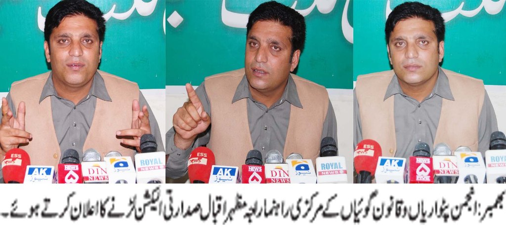 بھمبر ( ڈسٹرکٹ رپورٹر) نجمن پٹوا ریا ں وقا نو ن گو ئیا ں کے متحر ک را ہنما سا بق جنر ل سیکر ٹر ی ضلع بھمبر را جہ مظہر اقبا ل نے کشمیر پر یس کلب میں پر یس کا نفر نس کر تے ہو ئے کیا انجمن پٹواریا ں وقا نو ن گو ئیا ں کی طرف سے مر کز ی صدر کا الیکشن لڑ نے کا علا ن کر دیا ہے آزاد کشمیر بھر کے پٹوا ریوں اور گر داوروں نے بھر پو ر حما یت کا یقین دلا یا ہے کا میا ب ہو کر بحیثیت صدر تنظیم سا تھیو ں کی عزت نفس بحا ل کر نے در پیش مسائل کو حل کر نے اور پٹو اریو ں وگر دا وروں کے حقوق کا بھر پو ر تحفظ کر ینگے بھمبر کو ٹلی میر پو ر ،پو نچھ ڈویژ ن میں راولا کو ٹ ،کہو ٹہ ،با غ اور پلند ری کا دو رہ کر کے ملاقا تیں کیں ہیں جلد مظفر آباد کا دو رہ کر کے اپنی مشاورت مکمل کرو نگا اس موقع پر انہو ں نے مز ید کہا کہ محکمہ ما ل میں پٹواری اور گر داور کا بنیادی کر دا ر ہے انجمن پٹواریاں وقا نو ن گو ئیاں کا بنیادی مقصد پٹواری اور گر داور کی عزت نفس کی بحا لی اور محکمہ میں در پیش مسا ئل کے حل کیلئے اپنی صلا حیتو ں کو بروئے کا ر لا نا ہے آئند ہ الیکشن میں انجمن پٹوا ریاں وقانو ن گو ئیاں کی نما ئند گی کیلئے مر کز ی صدرکا الیکشن لرونگا انہو ں نے کہا کہ میں نے آزاد کشمیر بھر کا دو رہ کر کے سا تھیو ں سے مشاورت کی ہے جہا ںسے مجھے ہر ممکن تعاون اور حما یت کا مکمل یقین دلا یا گیا ہے بہت جلد مظفر آباد کا دو رہ بھی کر کے مشاورت مکمل کر لونگا انہو ں نے کہا کہ میں سر پرستی ضلعی صدر گر داور بھمبر طا رق بیگ ،ضلعی صدر کو ٹلی را جہ سفیر خا ن ،گر داور چو ہدری صا بر حسین ،تحصیل صدر چو ہدری محمدافضل ،تحصیل صدر بھمبر چو ہدر ی ساجد محمود ،تحصیل صدر بر نالہ مرزا عظیم دا د اور ضلعی جنر ل سیکر ٹر ی بھمبر پٹوا ری طا ہر محمود کی مکمل تا ئید اور حما یت پر انکا مشکو ر ہوں آمد ہ الیکشن میں ان کی طرف سے مکمل اتفاق را ئے اور اعتماد کا اظہا ر پر پو را اتروں گا آزاد کشمیر بھر میں پٹوا ریوں اور گر داور ں کے دفاتر کی تعمیر کیلئے بھر پو ر تحر یک مشن ہے جبکہ ریو نیو الا ونس کی اجرا ئیگی اور پٹوا ریو ں ،گر دا وروں کو دو را ن ملازمت درپیش مسائل کے حل کیلئے بھی کوششیں کی جا ئیگی محکمہ ما ل کے آفیسرا ن ،بیو رو کریسی اور سیاسی قیادتو ں سے ملکر ان تمام مسا ئل کے حل کیلئے بھر پو ر صلا حتیں برو ئے کا ر لا ونگا ۔