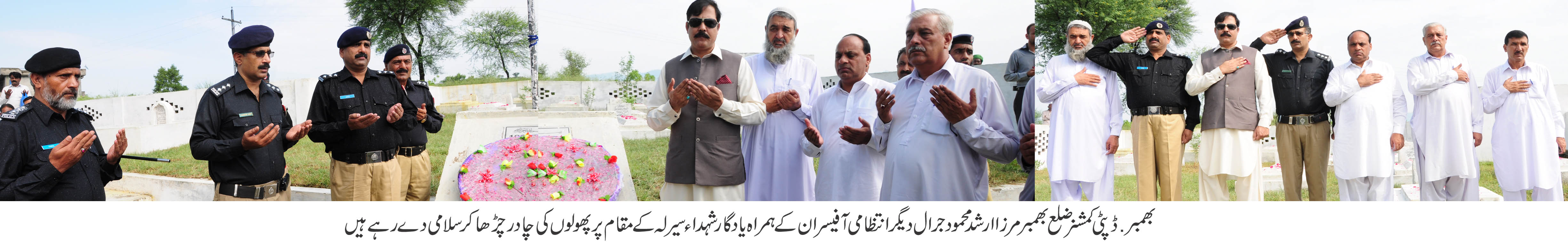 بھمبر (ڈسٹر کٹ رپو رٹر)6ستمبر کا دن منا نے کا مقصد اپنے قومی ہیروز کی عظیم قر با نیوں کو خرا ج تحسین پیش کر نا ہے 5اور6 ستمبر کی درمیا نی شب کو مکا ر دشمن نے جب سیا لکوٹ اور لاہور بارڈر سے پا کستا ن پر اچا نک حملہ کر دیا تھا تو ہما رے جو انوں نے جسم کیسا تھ بم با ند ھ کر دشمن کے ٹینک اڑا دئیے تھے اور پوری قوم انکی پشت پر کھڑ ی تھی آج بھی پوری کشمیر ی اور پاکستا نی قوم مسلح افوا ج پاکستا ن کے شا نہ بشا نہ کھڑ ی ہے ان خیا لات کااظہار ڈپٹی کمشنر مرزا ارشد محمود جرا ل نے سیرلہ کے مقام پر یاد گار شہدا پر منعقد ہ دعا ئیہ تقر یب سے خطا ب کر تے ہو ئے کیا اس موقع پر پو لیس کے چا ک وچو بند دستے کی سلا می پیش کی شہدا کے مزار پر پھو لوں کی چادر چڑ ھا ئی مرزا ارشد محمود جرا ل نے کہا کہ مقبو ضہ کشمیر کے اندر بھارتی افوا ج نے ظلم و ستم کا بازار گر م کر رکھا ہے بے گنا ہ نہتے کشمیریوں کو بے دردی کیسا تھ شہید کیا جا رہا ہے کشمیر یوں کی قر با نیاں را ئیگاں نہیں جا ئیں گی کشمیر جلد آزادہو گا انہوں نے کہاکہ چیف آف آرمی سٹا ف جنر ل را حیل شر یف نے تحر یک آزادی کشمیر اور ملک سے دہشت گردی کے خا تمے کے لئے جو اقدام اٹھا ئے ہیں و ہ لائق تحسین ہیں اس موقع پر اسسٹنٹ کمشنر را جہ طا رق خا ن ،ڈی ایس پی را جہ ندیم عارف ،ڈی ایس پی چو ہدری محمد امین ،تحصیلدار سر دار خا لدمحمود ،نا ئب تحصیلدار را جہ نثار احمد ،صدر کشمیر پر یس کلب را جہ نعیم گل ،سابق صدر نا صر شر یف بٹ ،ضلعی صدر یو نین آف جر نلسٹ ڈا کٹر طا رق محمود شاکر ،شیراز پرو یز مشتاق ،روما ن رضا ،ایس ایچ او سٹی مرزا شبیر حسین ،ڈسٹر کٹ ٹر یفک انچارج چو ہدری شبیر احمد ،چیف آفیسر ضلع کو نسل ذوالفقار احمد چاڑ ،چیف آفیسر بلدیہ ملک محمد رزاق اعوان ،ایس ڈی او چو ہدری محمد افضل،ایس ڈی او چو ہدری تبا رک ،سینٹر ی انسپکٹر مرزا ظفر اقبا ل ،اکاونٹنٹ چو ہدر ی ظفر اقبا ل ،سیاسی وسما جی را ہنمامرزا امتیاز حسین سمیت دیگر بھی مو جود تھے