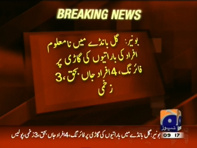 بونیر: گل باڈے میں نامعلوم افراد کی باراتیوں کی گاڑی پر فائرنگ، 4 افراد جاں بحق، 3 زخمی، باراتیوں کی جوابی فائرنگ، ایک حملہ آور مارا گیا، پولیس۔