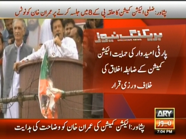 کپتان کو اپنے ہی صوبے میں نوٹس مل گیا، ضلعی الیکشن کمیشن کا پی کے 8 جلسہ کرنے پر عمران خان کو نوٹس، پارٹی امیدواروں کی حمایت الیکشن کمیشن کے ضابطہ اخلاق کی خلاف ورزی قرار۔