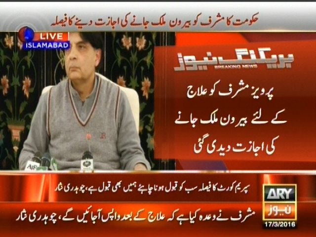 چوہدری نثار کا پرویز مشرف کا نام ای سی ایل سے نکالنے کا اعلان، پرویز مشرف کو علاج کے لئے بیرون ملک جانے کی اجازت دیدی گئی۔