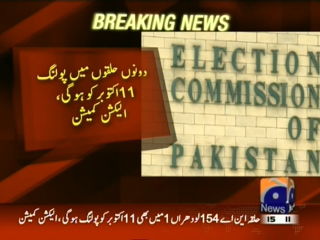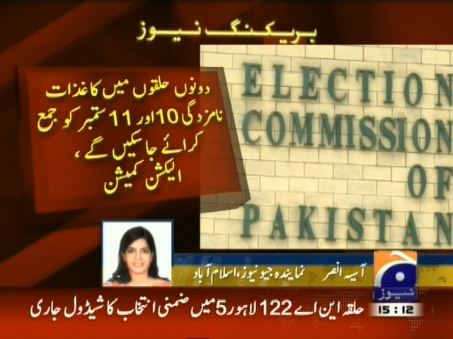 حلقہ این اے 122 اور این اے 154 میں ضمنی انتخابات کا شیڈول جاری، دونوں حلقوں میں پولنگ 11 اکتوبر کو ہو گی، دونوں حلقوں میں کاغذات نامزدگی 10 اور 11 ستمبر کو جمع کرائے جا سکتے ہیں، الیکشن کمیشن۔