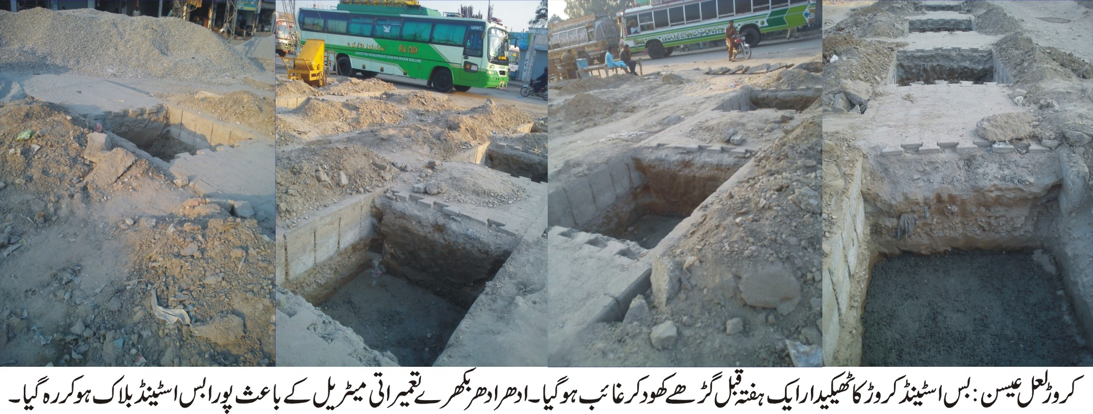 کروڑ لعل عیسن ( نامہ نگار) ٹھیکیدار بس اسٹینڈ کا کام ادھورہ چھوڑ کر غائب ہو گیا۔ مٹی بجری اور دیگر میٹریل کے باعث روڈ بلاک۔ ٹی ایم اے حکام زیر تعمیر کام فی الفور مکمل کروائیں۔