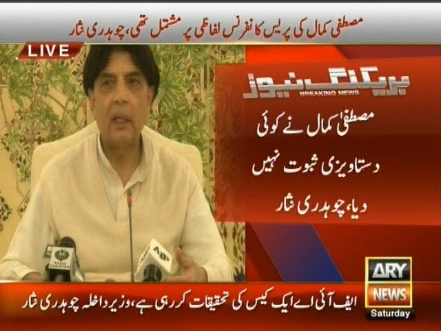 جب تک کرکٹرز کیلئے بھارت محفوظ ہونے کا پیغام نہ آئے ٹیم نہ بھیجی جائے، جب تک حکومت مطمئن نہیں ہو گی کرکٹ ٹیم بھارت نہیں جائے گی، مصطفی کمال کی پریس کانفرنس لفاظی پر مشتمل تھی، مصطفی کمال نے کوئی دستاویزی ثبوت نہیں دیا، چوہدری نثار۔