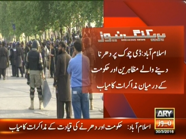 اسلام آباد : ڈی چوک پر دھرنا دینے والے مظاہرین اور حکومت کے درمیان مذاکرات کامیاب، ثروت اعجاز قادری کچھ دیر بعد مظاہرین کے پاس آ کر دھرنا ختم کرنے کا اعلان کرینگے، ذرائع۔