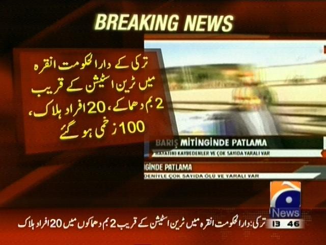 ترقی کے دارلحکومت انقرہ میں ٹرین اسٹیشن کے قریب 2 بم دھماکے، 20 افراد ہلاک، 100 زخمی ہوگئے،دھماکے جس مقام پر ہوئے وہاں لوگ امن واک کیلئے جمع ہو رہے تھے۔
