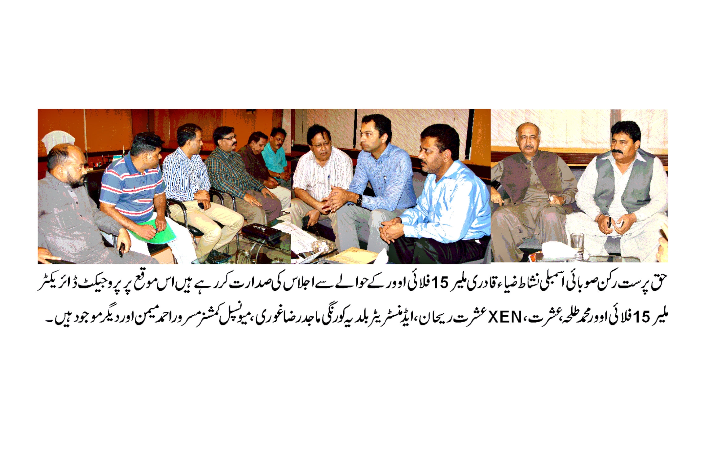 ان خیالات کا اظہار حق پرست رکن صوبائی اسمبلی نشاط محمد ضیاء قادری نے ملیر 15فلائی اوور کی تعمیر کی راہ میں حائل رکاوٹوں کو دور کرنے کے سلسلے میں منعقدہ اجلاس کی صدارت کرتے ہوئے کیا اجلاس میں ملیر 15فلائی اوور کے پروجیکٹ ڈائریکٹر محمد طلحہ ،XENملیر 15فلائی اوور عشرت ریحان ،ایڈمنسٹریٹر بلدیہ کورنگی ماجد رضا غوری ،میونسپل کمشنر مسرور احمد میمن،اسسٹنٹ کمشنر شاہ فیصل حسن رضا ،ڈپٹی ڈائریکٹر انٹی انکروچمنٹ نسیم الغنی ،شاہ فیصل زون بلدیہ کورنگی کے فوکل پرسن اسلم پرویز ،انفارمیشن آفیسرشاہ فیصل زون محمد ارشد نے شرکت کی اجلاس میں حق پرست رکن صوبائی اسمبلی نشاط محمد ضیاء قادری کو پروجیکٹ ڈائریکٹر ملیر 15فلائی اوور محمد طلحہ نے فلائی اوور سے متعلق تفصیلی بریفنگ دی اور تعمیراتی کاموں میں حائل رکاوٹو ں تجاوزات اور غیر قانونی تعمیرات کے خاتمے میں دشواریوں سے آگاہ کیا اس موقع پر حق پرست رکن صوبائی اسمبلی نشاط محمد ضیاء قادری نے کہاکہ فلائی اوور کی تعمیر سے شاہ فیصل اور ملیر کی عوام کو آمد و رفت میں سہولت میسر آئے گی۔
