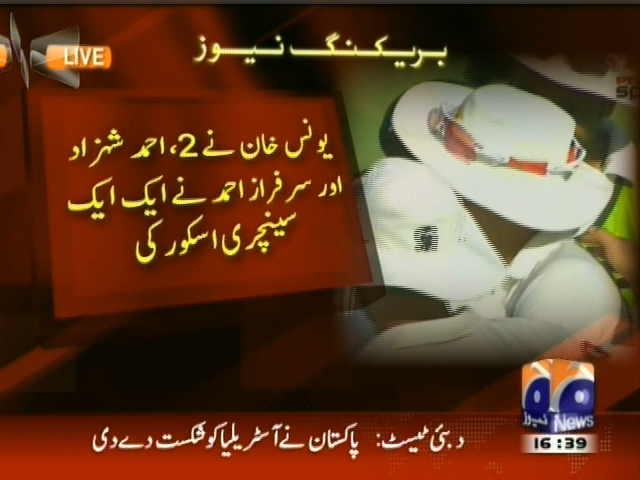 دبئی ٹیسٹ میں پاکستان نے آسٹریلیا کو شکست دے دی۔ یونس خان نے 2، احمد شہزاد اور سرفراز احمد نے ایک ایک سینچری اسکور کی۔