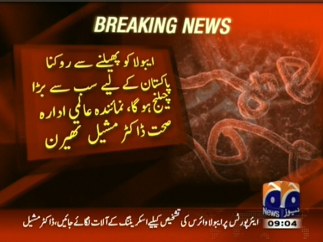 ایبولا وائرس جلد یا بادیر پاکستان پہنچ جائے گا، عالمی ادارہ صحت کی وارننگ۔ایبولا کو پھیلنے سے روکنا پاکستان کیلیے سب سے نڑا چیلنج ہوگا، نمائندہ عالمی ادارہ صحت ڈاکٹر مشیل تھیرن۔