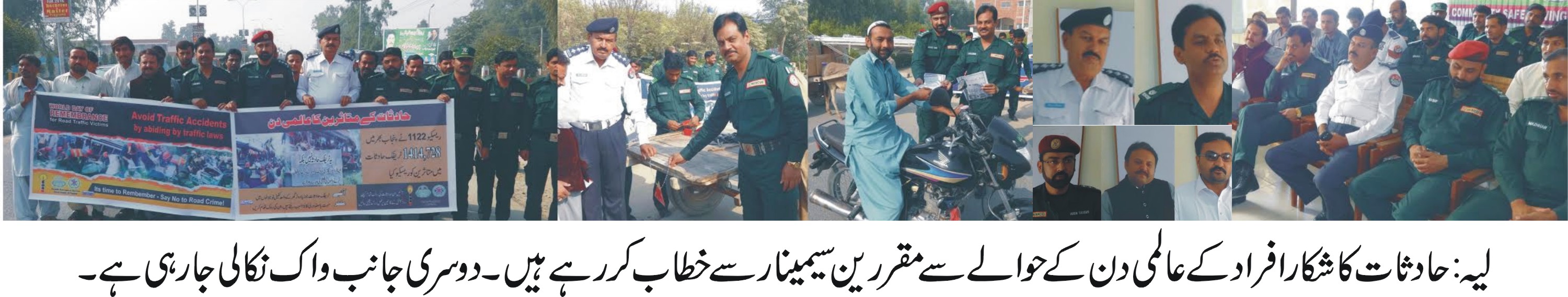 لیہ (نامہ نگار) حادثات کے متاثرین کے عالمی دن کے سلسلہ میں ریسکیو 1122لیہ میں ایک سیمینار منعقد کیا گیا۔جس میں ریسکیورز ،، ٹریفک اہلکار اور ریسکیو رضاکاران نے شرکت کی ۔ سیمینار سے خطاب کرتے ہوئے ڈسٹر کٹ ایمرجنسی آفیسر ڈاکٹر محمد تسلیم نے خطاب کرتے ہوئے کہا کہ دوران ڈرائیونگ غفلت ، لاپرواہی اور تیز رفتاری حادثات کا سبب بنتی ہے اور 90فیصد حادثات رونما ہوتے ہیں ، کم عمر افرادجن کے پاس ڈرائیونگ لائسنس نہیں ہوتا اور ٹریفک کے اصولوں سے نا واقفیت بھی حادثات کا سبب بنتی ہے ۔ ٹریفک انسپکٹر رسول بخش ، سلیم دانش ، عمران شاہ اور عرفان شاہ نے خطاب کرتے ہوئے کہاکہ دوران ڈرایئونگ موبائل کا استعمال ، کھانے پینے ، میوزک پلیر سے کھیلنے اور روڈ پر توجہ نہ رکھنے سے حادثات میں دن بدن اضافہ ہو رہا ہے ، انہوں نے کہا کہ ڈرائیور سیٹ کے ساتھ خالی بوتلیں نہ رکھیں خالی بوتل بریک کے درمیان پھنس کر حادثے کا باعث بن سکتی ہے ، سلیپر کی جگہ سینڈل یا سخت جوتی استعمال کریں تاکہ پائو ں سلپ نہ ہو، انہوں نے مزید کہا کہ ڈرائیونگ کا پہلا اصول صبر اور تحمل ہے جبکہ جلد بازی کا نتجہ موت کی صورت ہی نکلتا ہے ۔ بعد ازاں ریسکیو آفس سے آگاہی واک نکالی گئی جس میں شرکا ء نے بینرز اور پلے کارڈز اُٹھا رکھے تھے ۔ جبکہ واک کے بعد چوبارہ روڈ پر گدھا رہڑیوں، موٹر سائیکل رکشوں پر ریفلکٹرز لگائے گئے اور آگاہی پمفلس تقسیم کئے گئے۔
