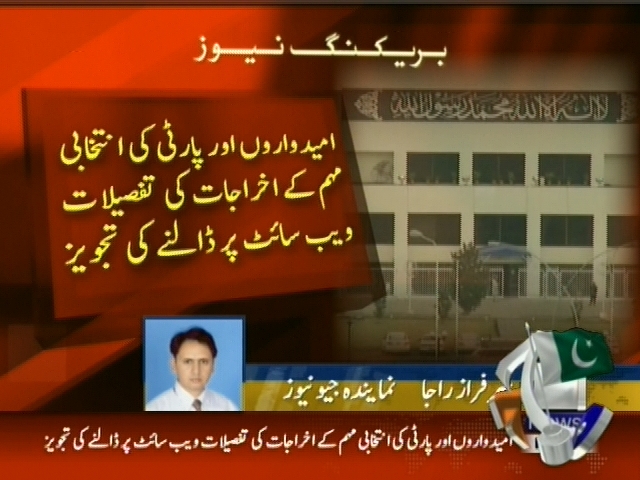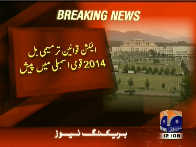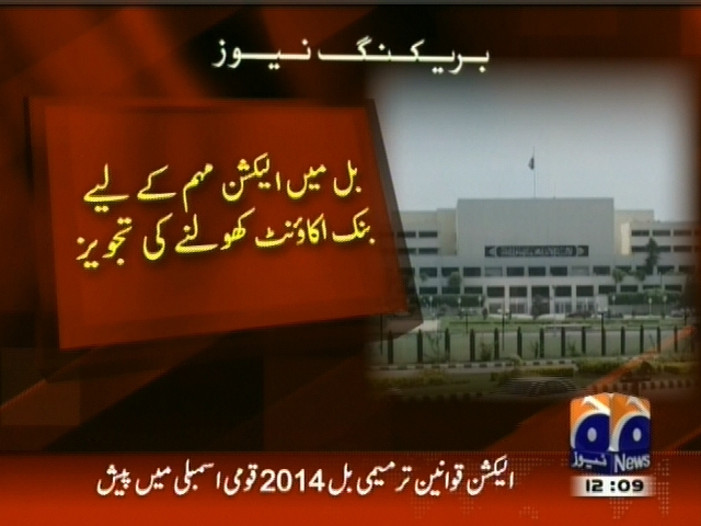 الیکشن قوانین ترمیمی بل 2014 قومی اسمبلی میں پیش۔ بل پیپلز پارٹی کے اراکین نے ایوان میں پیش کیا۔بل میں الیکشن مہم کیلیے بنک اکاونٹ کھولنے کی تجویز۔ امیدواروں اور پارٹی کی انتخابی مہم کے اخراجات کی تفصیلات ویب سائٹ پر ڈالنے کی تجویز۔