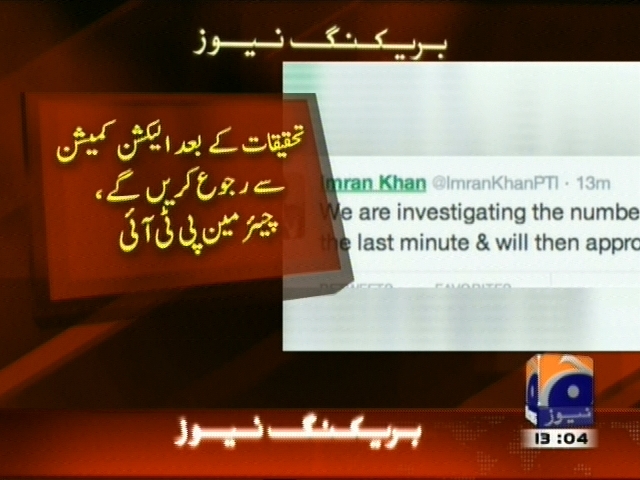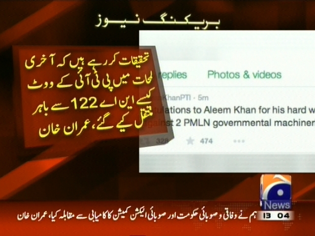 ضمنی انتخاب کے نتائج، تحریک انصاف کی اخلاقی فتح ہے، عمران خان، تحقیقات کر رہے ہیں کہ آخری لمحات میں پی ٹی آئی کے ووٹ کیسے این اے 122 سے باہر منتقل کیے گئے، تحقیقات کے بعد الیکش کمیشن سے رجوع کریں گے، علیم خان کو بھرپور محنت دکھانے پر مبارکباد دیتا ہوں، عمران خان۔