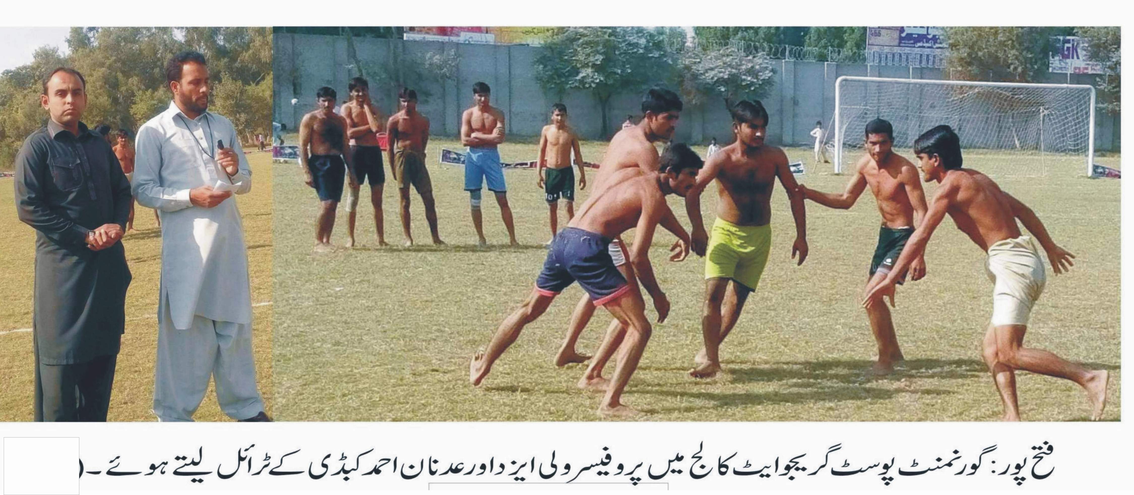 فتح پور (نمائندہ خصوصی) ہمارے روایتی کھیل نا صرف ہماری پہچان بلکہ بہترین صحتمندانہ سرگرمی ہیں،کالج کی سطح کے طلباء کی صلاحیتوں و ٹیلنٹ کو ملکی سطح تک سامنے لانے کیلئے بھر پور کاوشیں کر رہے ہیں،ان خیا لات کا اظہار گورنمنٹ پوسٹ گرایجو ایٹ کالج فتح پور کے پروفیسر چوہدری ولی ایزد گجر اور پرو فیسر عدنان احمد نے کالج میں آل پاکستان انٹر بورڈ کبڈی چیمپئن شپ 2016ء میں شرکت کیلئے بورڈ آف انٹر میڈیٹ اینڈ سیکنڈری ایجو کیشن ڈیرہ غا زی خان کی ٹیم کے ٹرائلز کے موقعہ پر کیا۔اس موقعہ پر کالج طلبا ء نے بہت اچھے و پر جوش انداز میں ٹرائل دیئے،مذکورہ دونوں پروفیسرز صاحبان نے کہا کہ آل پاکستان مقابلوں میں شرکت کی ٹیم کی تیاری کے ٹرائل فتح پور کالج میں ہونا بڑے اعزاز کی بات ہے اور انشا ء اللہ اس کالج کے طلباء ملک بھر میں اپنا،اپنے اساتذہ،کالج اور شہر فتح پور کا نام روشن کریں گے۔