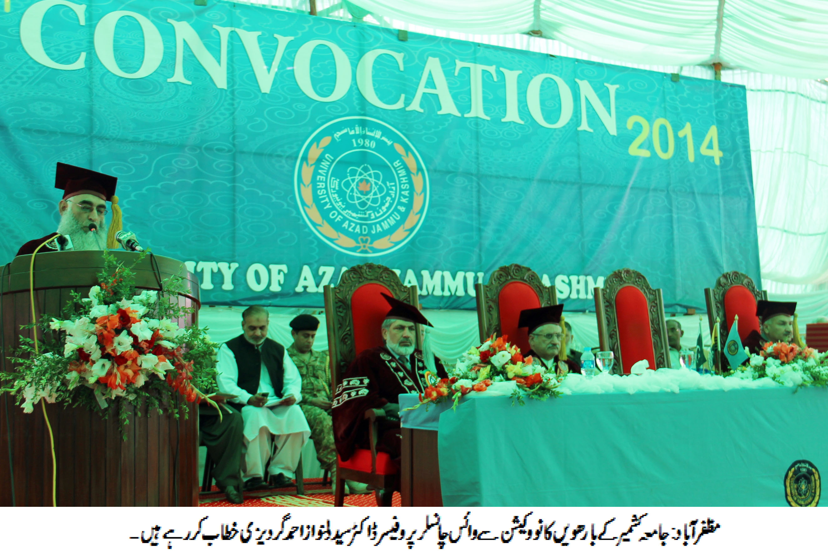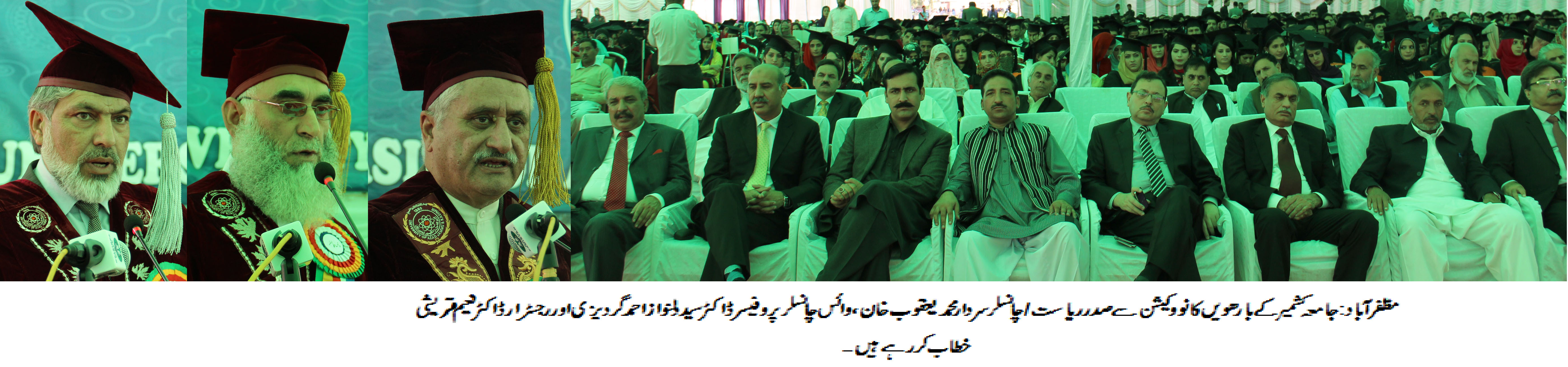 مظفرآباد (پر یس ریلیز) آزاد جموں و کشمیر یونیورسٹی کابارھواں کانووکیشن مورخہ 29 اکتوبر 2014 کو چہلہ کیمپس مظفرآباد میں منعقد ہوا۔35 طلباء و طالبات کو گولڈ میڈل عطا کیے گے، جبکہ 6000 سے زائد طلباء و طالبات نے اپنی ڈگریاں حاصل کیں ۔کانووکیشن کے مہمان خصوصی صدر ریاست و چانسلر سردار محمد یعقوب خان نے اپنے خطاب میں کہا کہ نئی جامعات اور میڈیکل کالجوں کے قیام پر سوالات اٹھانے والے تعلیم دشمن پالیسی پر عمل پیرا ہیں۔ کسی بھی سطح پرمعیار تعلیم پر سمجھوتہ نہیں کیا جائے گا۔
