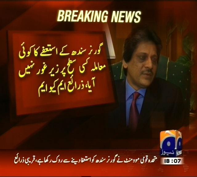 گورنر سندھ عالعباد شرت کے مستعفی ہونے کا پارٹی کی سطح پر کوئی فیصلہ نہیں ہوا، گورنر سندھ کے استعفے کا کوئی معامل کسی سطح پر زیر غور نہیں آیا، ذرائع ایم کیو ایم۔