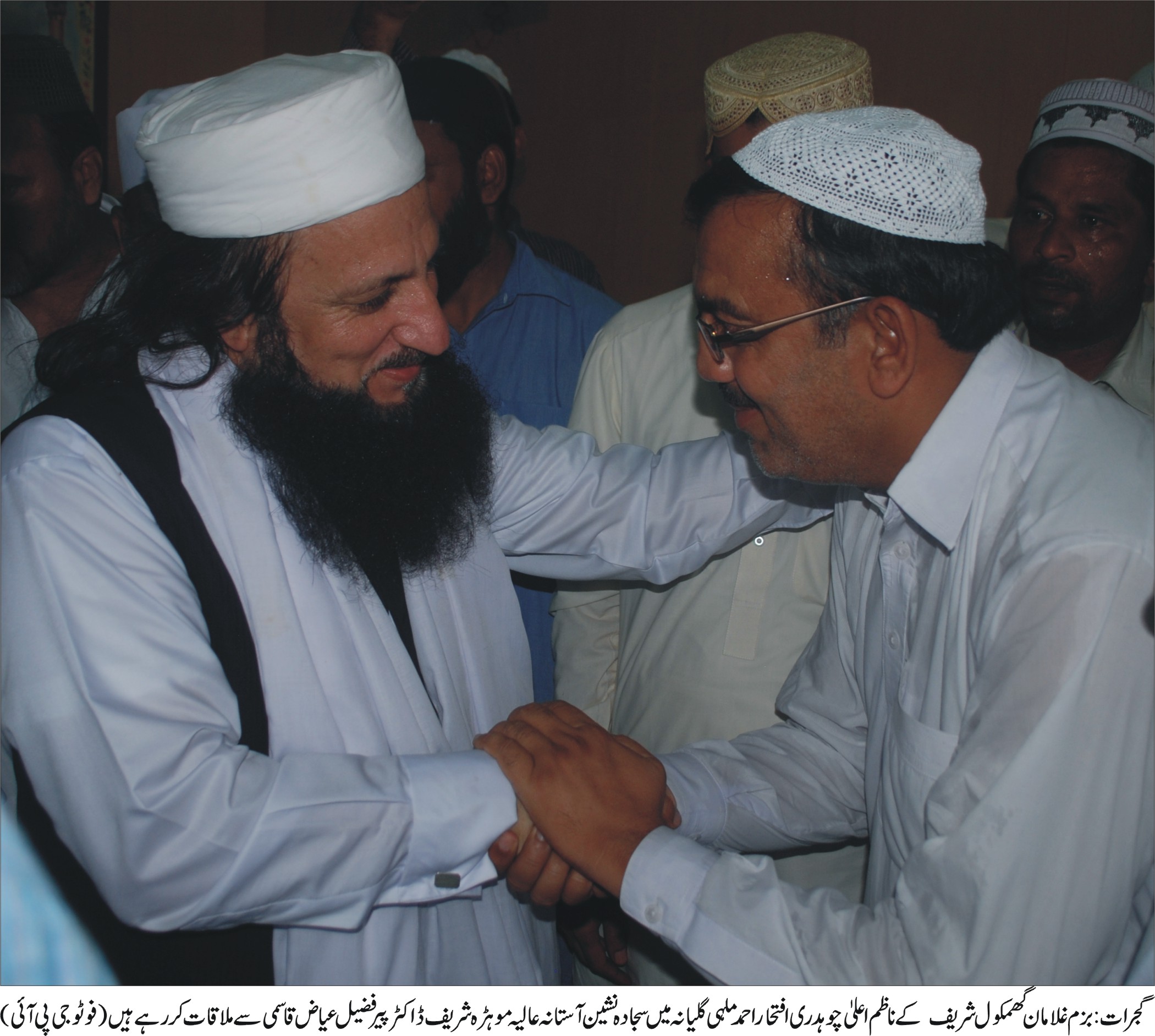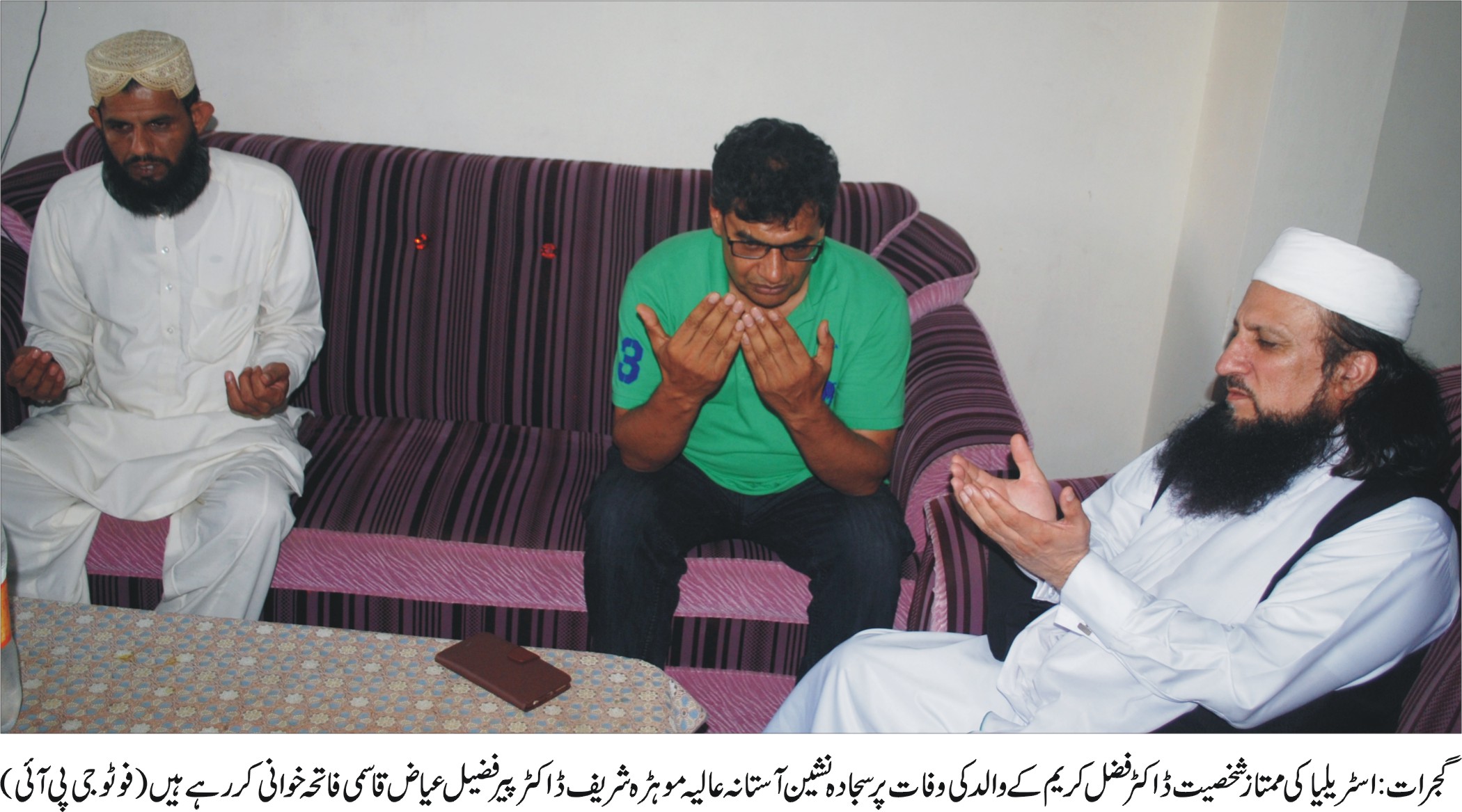 گجرات (جی پی آئی) ممتاز روحانی شخصیت ڈاکٹر پیر شہزادہ فضیل عیاض قاسمی والئیے موہڑہ شریف چیئرمین قاسمیہ زاہدیہ ٹرسٹ رجسٹرڈ و صدر اتحاد المشائخ پاکستان گزشتہ روز تعزیت کیلئے اسٹریلیا کی ممتاز شخصیت ڈاکٹر فضل کریم چوہدری کی رہائشگاہ پھلروان گئے اور ان کے والد محترم چوہدری روشن علی رحمانیہ کی وفات پر گہرے رنج و غم کا اظہار کیا اور مرحوم کے ایصال ثواب کیلئے فاتحہ خوانی کی اس موقع پر اہم شخصیات موجود تھیں۔