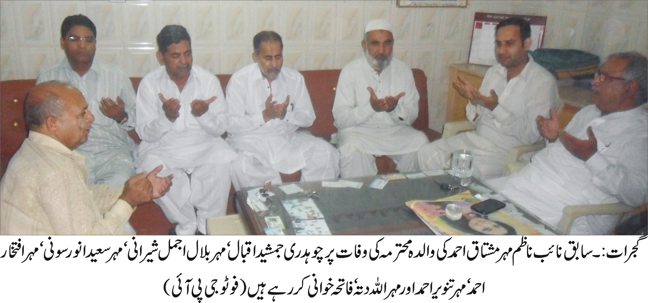 گجرات: سابق نائب ناظم مہر مشتاق احمد کی والد ہ محترمہ کی وفات پر چوہدری جمشید اقبال، مہر بلال اجمل شیرانی، مہر سعید انور سونی، مہر افتحار احمد، مہر تنویر اور مہر اللہ دتہ فاتحہ خوانی کر رہے ہیں۔۔