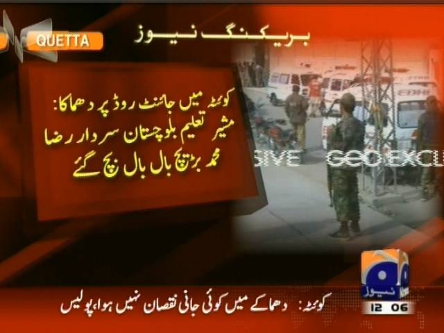 کوئٹہ: جوائنٹ روڈ پر دھماکہ۔ دھماکے کے بعد فائرنگ کی بھی اطلاعات۔ کوئٹہ میں جوائنٹ روڈ پر دھماکہ مشیر تعلیم بلوچستان سردار رضا محمد بڑیچ بال بال بچ گئے۔