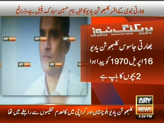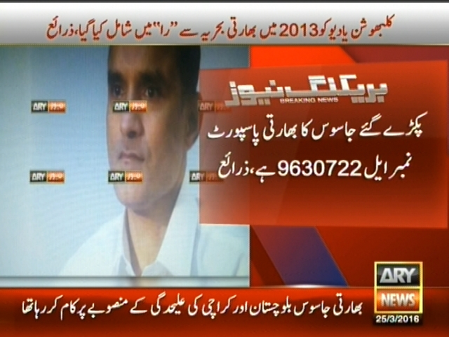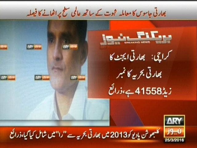 بھارتی جاسوس کا معاملہ ثبوت کے ساتھ عالمی سطح پر اٹھانے کا فیصلہ، بھارتی ایجنٹ کا بھارتی بحریہ کا نمبر زیڈ 41558 ہے، بھارتی جاسوس کلبھوشن یادیو 16 اپریل 1970 کو پیدا ہوا 2 بچوں کا باپ ہے، پکڑے گئے جاسوس کا بھارتی پاسپورٹ نمبر ایل 9630722ہے، ذرائع۔