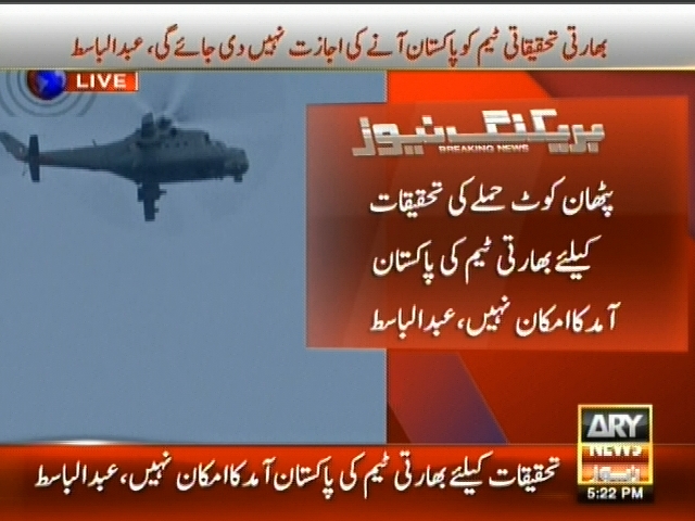 بھارتی تحقیقاتی ٹیم کو پاکستان آنے کی اجازت نہیں دی جائے گی، مقابلے کی بات نہیں، دو طرفہ تعاون کا معاملہ ہے، پٹھان کوٹ حملے کی تحقیقات کیلئے بھارتی ٹیم کی پاکستان آمد کا امکان نہیں، عبدالباسط۔