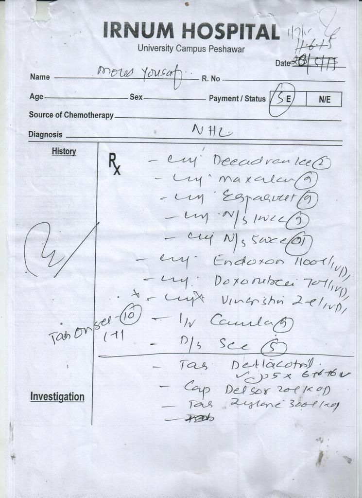 اس سے پہلے گورنمنٹ لیڈی ریڈنگ ہسپتال پشاور اور شوکت خانم ہسپتال لاہور سے مایوس ہو چکا ہوں، کیونکہ ان ہسپتال کے ڈاکٹروں نے مہنگے ترین ادویات تجویز کی تھی۔