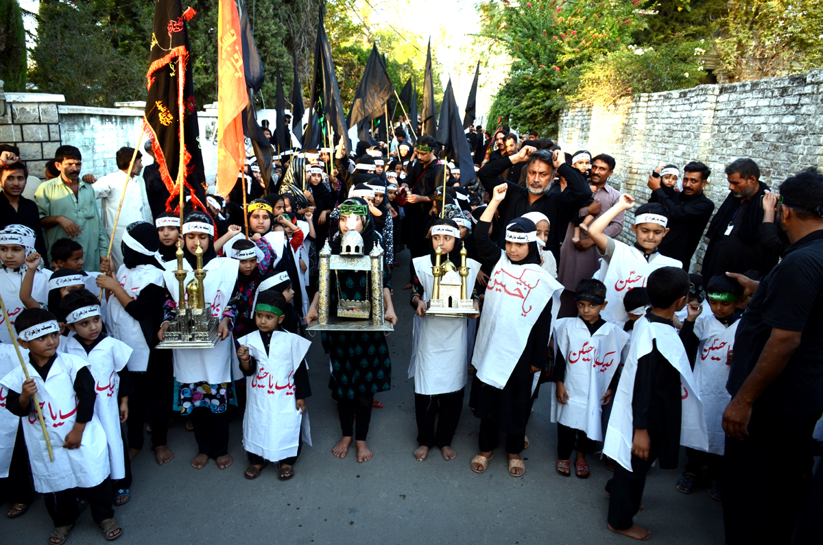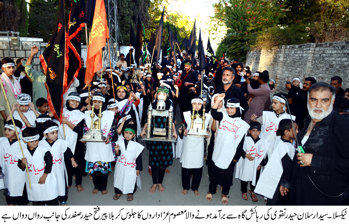 ٹیکسلا (ڈاکٹر سید صابر علی سے) سابقہ روائت کے مطابق امسال بھی نویں محرم کو کربلا کے معصوم شہید شہزادہ علی اصغر کی یاد میں شیعہ علماء کونسل تحصیل ٹیکسلا اور جعفریہ سٹودنٹ آرگنائزیشن کے زیر اہتمام معصوم عزاداروں پر مشتمل ماتمی جلوس برمقام رہائش گاہ سید ارسلان حیدر نقوی برآمد ہوا جو اپنے روائتی راستے سے ہویا ہوا کربلا پیر فتح حیدر صفدر اختتام پذیر ہوا ،اس موقع پر بچوں کے والدین کی بھی کثیر تعداد موجود تھی،معصوم بچوں نے لبیک یا حسین ، لبیک یاحسین کی صدائیں بلند کر کے شہداء کربلا سے اپنی عقیدت کا اظہار کیا۔