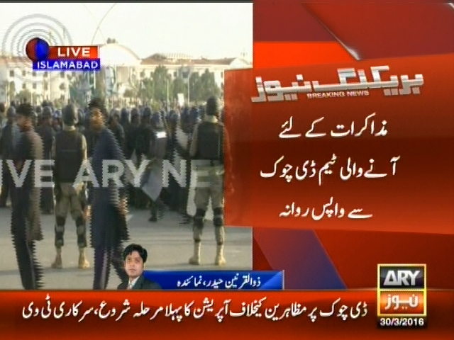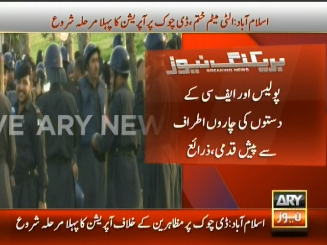 اسلام آباد: ڈی چوک پر دھرنا مظاہرین کیخلاف پولیس کا آپریشن شروع، ڈی چوک پر دھرنا مظاہرین کیخلاف آپریشن کا پہلا مرحلہ شروع، پولیس اور ایف سی کے دستوں کی چاروں اطراف سے پیش قدمی، مذاکرات کیلئے آنے والی ٹیم ڈی چوک سے واپس روانہ، ذرائع۔