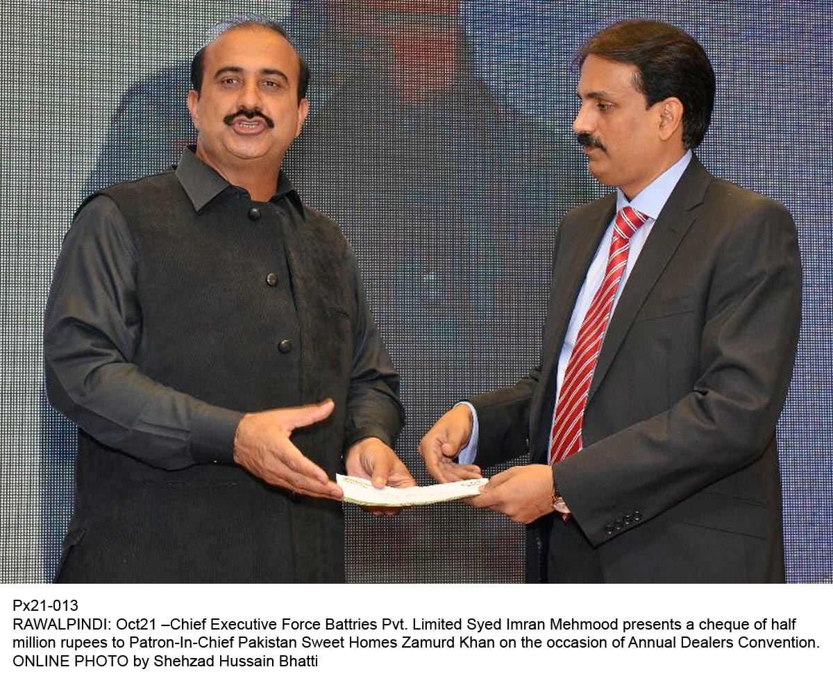انہوں نے فورس بیٹریز کی طرف سے فلاحی کاموں کے آغاز پرپاکستان سویٹ ہوم کے چیرمین زمرد خان کو 5 لاکھ روپے کا چیک پیش کیا اور اعلان کیا کہ یکم جولائی سے جو بھی بیڑی مارکیٹ میں فروخت ہو گی اس میں سے مخصوص حصہ فلاحی کاموں پر خرچ کیا جائے گا۔اس موقع پر پاکستان بھر سے آنے والے ڈیلروں میںسالانہ بیٹریز کی فروخت میںٹارگٹ مکمل کرنے پر 21 عدد کاریں، 30عدد ہنڈا موٹر سائیکل، سینکڑوں تولے سونا اور دیگر قیمتی انعامات تقسیم کیے گئے۔