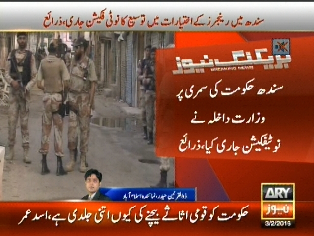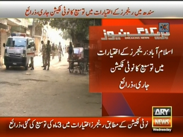 اسلام آباد: رینجرز کے اختیارات میں توسیع کا نوٹیفکیشن جاری، سندھ حکومت کی سمری پر وزارت داخلہ نے نوٹیفکیشن جاری کیا، ذرائع۔
