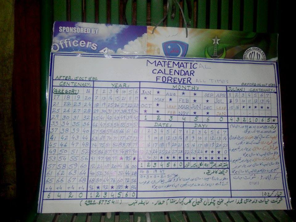 اس کے ساتھ یہ بھی پتہ چلاکہ کیلنڈر کو رجسٹرڈ کرانے کا بھی پراسز ہوتاہے تو میں نے ارادہ کیا کہ میں اس کو رجسٹر کروالوں ریپ والو ں سے بات کی تو انہوں نے کہا کہ آپ اس کیلنڈر کو کموز کراواکر اس کی تین تین کاپیاں بمع رجسٹریشن فیس کے جمع کروا دوں۔جو کیلنڈر میں پریس سے شائع کراچکا تھا وہ سوسال کا تھا اور وہ دوحصوں پر مشتمل تھا میں نے اس کو٠١سے لامحدود مدت تک کا کیلنڈر ایک ساتھ بنانے کا فیصلہ کیا اور اس کے ساتھ میں نے میتھ کیلنڈر بھی فار آل ترتیب دیا ہے۔