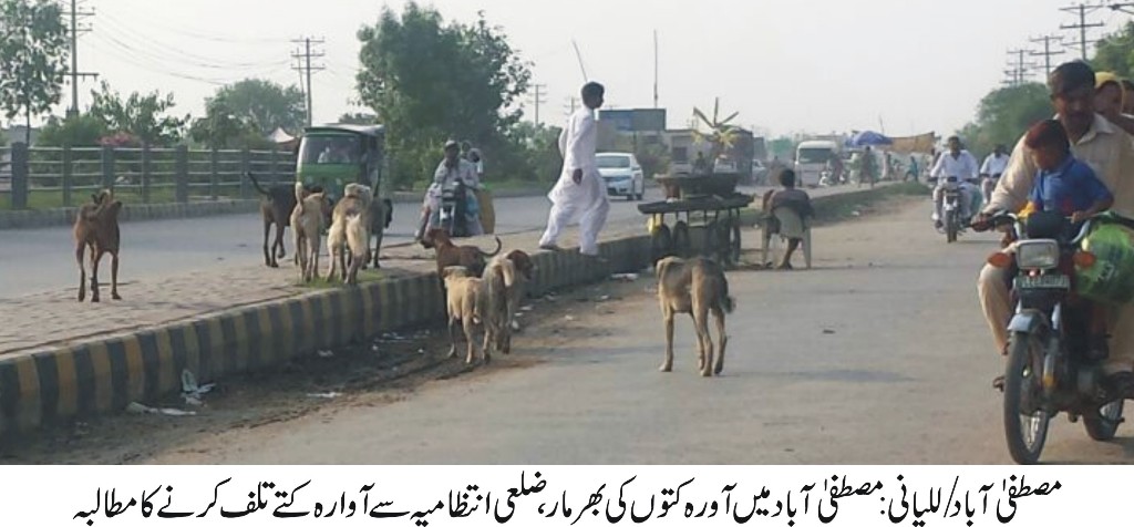 مصطفی آباد/للیانی (نامہ نگار) مصطفی آباد میں آورہ کتوں کی بھر مار، بچے خوف زدہ، کتے مار مہم چلانے کا مطالبہ، تفصیلات کے مطابق مصطفی آباد میں گزشتہ کئی ماہ سے آوارہ کتوں کی ٹولیاں شہر بھر میں گشت کرتی نظر آتی ہیں، جس کی وجہ سے بچے خوف زدہ نظر آتے ہیں آورہ کتے اکثر راہ گیروں کو کاٹ لیتے ہیں، ای ڈی او ہیلتھ ودیگر متعلقہ محکوں کی پر اسرار خاموشی پر شہری سراپہ احتجاج، اہل علاقہ کی طرف سے اعلی حکام سے فوری نوٹس لیتے ہوئے آورہ کتوں کو تلف کرنے کا مطالبہ۔