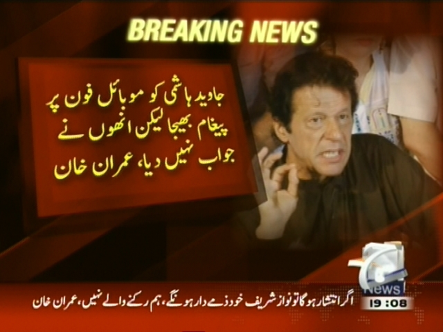 جاوید ہاشمی کو موبائل فون پر پیغام بھیجا لیکن انھوں نے جواب نہیں دیا، عمران خان، جاوید ہاشمی عمران خان سے ناراض ہیں، عمران کے بیان سے تصدیق ہو گئی۔