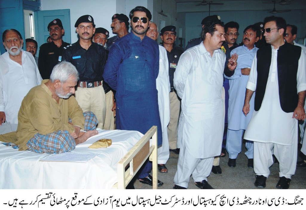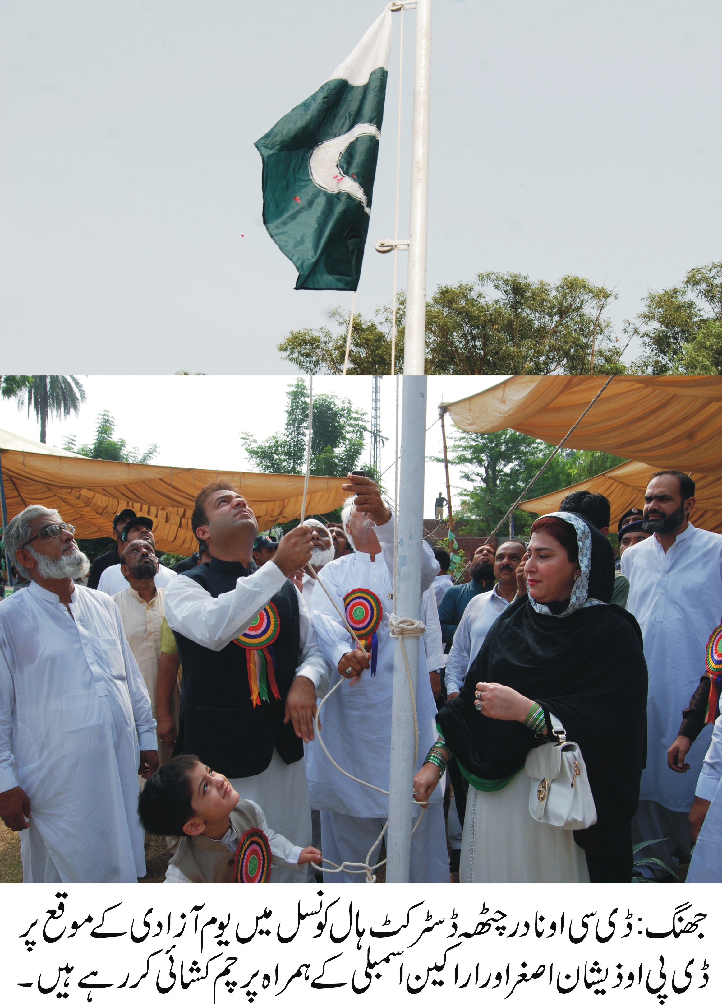 جھنگ (ڈسٹرکٹ رپورٹر) جشن آزادی کی تقریبات کے سلسلہ میں ڈسٹرکٹ کونسل ہال کے سبزہ زار میں قومی پرچم کشائی کی ایک پروقار تقریب منعقد ہوئی۔ صبح8:58پر سائرن بجائے گئے اور ایک منٹ کی خاموشی اختیار کی گئی۔شیڈول کے مطابق ضلع کی بڑی شاہراہوں پر ایک منٹ کیلئے ٹریفک رک گئی۔پرچم کشائی کی تقریب میں ڈسٹرکٹ کوآرڈی نیشن آفیسر نادر چٹھہ،ڈسٹرکٹ پولیس آفیسر ذیشان اصغر، ایم این اے شیخ اکرم کے صاحبزادے شیخ نواز اکرم ،ایم پی ایزمحترمہ راشدہ یعقوب شیخ،خالد محمود سرگانہ، خرم خان سیال،محمد خان بلوچ،اسسٹنٹ کمشنرجھنگ عمران عصمت پنوں،ایم ایس ڈی ایچ کیو ڈاکٹر ممتاز سیال،ای ڈی او سی ڈی خالد راجو،ڈی او سوشل ویلفیئر اظہر عباس عادل،ڈی او ماحولیات محمد نواز سیال،ڈی او سپورٹس طاہر ملک،ای ڈی او فنانس طارق لک اورڈسٹرکٹ ایمرجنسی آفیسر ریسکیو1122ڈاکٹر طارق سعیدکے علاوہ اساتذہ کرام،طلباء اورسول سوسائٹی سے لوگوں کی بڑی تعداد نے تقریب میں شرکت کی۔تقریب میں پولیس اور ریسکیو1122کے دستوں نے ہلالی پرچم کو سلامی پیش کی اور مارچ پاسٹ کیا۔مقامی فنکاروں نے یوم آزادی کے حوالہ سے خاکے جبکہ بچیوں نے ملی نغمے پیش کیے۔ ڈی سی او نادر چٹھہ کی جانب سے مہمانان گرامی کو یادگاری شیلڈ پیش کی گئیں۔بعدا زاں ڈی سی او نادر چٹھہ اور ڈی پی او ذیشان اصغر ڈسٹرکٹ ہیڈ کوارٹر ہسپتال گئے جہاں انہوںنے مریضوں کی عیادت کی اور انہیں مٹھائی ،کھانا اور گفٹ تقسیم کرنے کے علاوہ ڈسٹرکٹ جیل جھنگ میں قیدیوں میں جشن آزای پیکٹس بھی تقسیم کئے ۔ٹی ایم اے آفس میں پرچم کشائی تقریب ہوئی جس میں ٹی ایم او رانا محمد عارف کے علاوہ دیگر افسران نے شرکت کی۔بعد ازاں شہید روڈ نور مسجد میں شہداء کی قبروں پر پھولوں کی چادریں چڑھائیں اور فاتحہ خوانی کی گئی۔