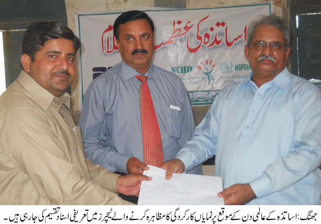 جھنگ (ڈسٹرکٹ رپورٹر) محکمہ تعلیم اور نیشنل کمیشن فار ہیومن ڈویلپمنٹ کے زیر اہتما م اسلامیہ ہائی سکول میں اساتذہ کے عالمی دن کے موقع پر تقریب کا انعقاد کیاگیا جس میں ای ڈی او ایجوکیشن نسیم احمد زاہد،ڈسٹرکٹ جنرل منیجراین سی ایچ ڈی احسان اللہ ،اساتذہ کرام، طالب علموںاور مختلف شعبہ ہائے زندگی سے تعلق رکھنے والی شخصیات نے شرکت کی۔تقریب کے دوران مقررین نے خطاب کرتے ہوئے کہا کہ ملکی تعمیرو ترقی اور آئندہ نسل کی تعلیم و تربیت کے حوالہ سے اساتذہ کرام کا کلیدی کردار کبھی بھی فراموش نہیں کیا جا سکتا اور ان کی خدمات کا اعتراف کرتے ہوئے ہر سطح پر حوصلہ افزائی ہونی چاہیے ۔انہوںنے اساتذہ کرام کے مثالی کردار پر روشنی ڈالتے ہوئے کہا کہ یہ ایک پیغمبرنہ پیشہ ہے لہٰذا ان کی عزت و تکریم میں کوئی کسر اٹھا نہ رکھی جائے گی۔ جنرل منیجر احسان اللہ نے اساتذہ کرام کو سلام پیش کرتے ہوئے کہا کہ استاد معاشرے کا قابل قدر اور باعزت فرد ہونے کے ساتھ ساتھ عظیم سرمایہ بھی ہے کیونکہ اعلیٰ اور معتبر ترین شخصیات تدریسی شعبہ سے وابستہ رہی ہیںجو مختلف شعبوں میں باصلاحیت افراد تیار کررہے ہیں۔بعد ازاں نمایاں کارکردگی کا مظاہرہ کرنے والے مرد و خواتین ٹیچر زمیں تعریفی اسناد تقسیم کی گئیں۔