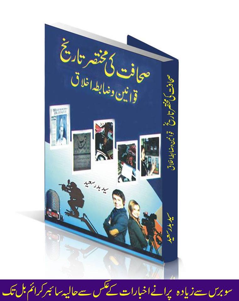 اردو کے ترقی پسند شاعر فیض احمد فیض نے شائد صحافتی برادری کیلئے ایک بڑی انقلابی نظم کہی ہے ۔اس کا ہر ایک لفظ دل ودماغ میں اترجاتا ہے اور جسم وجان میں ایک جوش وولولہ کی ایک نئی روح پھونک جاتا ہے ۔بول کہ لب آزاد ہیں تیرے بول کہ زباں اب تک تیری ہے کتابوں میں عوام الناس کو ادب ، صحافت ، سیاست ، سماجیات ، نفسیات ، کامرس ، مملکت ، عالمی حالات ، مشرق و مغرب ،سیاست اور معاشرتی ،سماجی مسائل کی عکاسی مل جاتی ہے۔کتابیں سیاسی ، سماجی ، ثقافتی روحانی ، تہذیبی شعور اور ذہن کو بالیدگی عطا کرتی ہیں اور ذہنوں کی آبیاری کرتے ہیں۔ سید بدر سعید کی کتاب صحافت کی ایک مختصر تاریخ ہے ،جس میں پاکستان سمیت برصغیر پاک وہند کی صحافت کے ارتقائی عمل کا مکمل طور پر احاطہ کرنے کی کوشش کی ہے۔