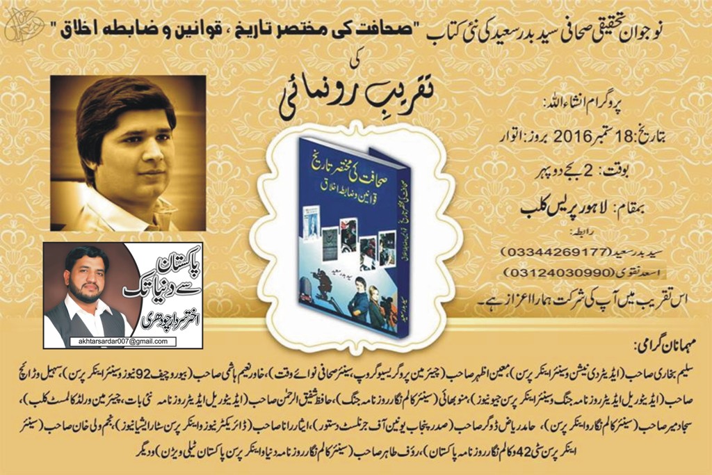 سید بدر سعید ایم فل ریسرچ اسکالر ہیں، ایک درد دل رکھنے والا نوجوان ہے ،ہر وقت ہزاروں دوستو ںکی دعائوں میں رہتا ہے ، اس کی پہلی شہرہ آفاق کتاب خود کش بمبار کے تعاقب میں ، کے بعد نئی آنے والی کتاب صحافت کی مختصر تاریخ ،قوانین و ضابطہ اخلاق کی تقریب رونمائی 18ستمبر 2016 ء کو لاہور پریس کلب میں منعقد ہورہی ہے، جس میں نامور سینئر صحافی ، سینئرکالم نگار ،ایڈیٹرزاور اینکرپرسن ،سیلم بخاری ،معین اظہر ،خاور ہاشمی ،سہیل وڑائچ ،منو بھائی ،حافظ شفیق الرحمن ،سجاد میر ،حامد ریاض ڈوگر ،ایثار رانا ،نجم ولی خان ،روف طاہر سمیت دیگر اظہار خیال کریں گے۔ دوست احباب کو دعوت عام ہے۔