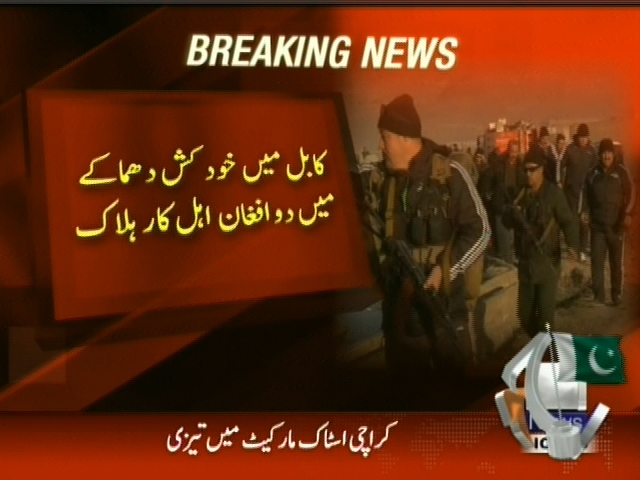 کابل میں خودکش دھماکے میں دو افغان اہلکار ہلاک۔ سیکیورٹی اہلکاروں کی فائرنگ سے دو حملہ آور مارے گئے۔ طالبان نے حملے کی زمہداری قبال کر لی۔