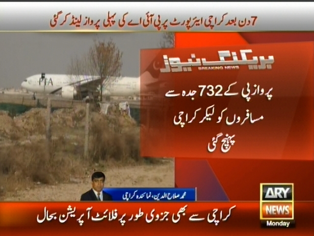 کراچی: 7 دن بعد کراچی ایئرپورٹ پر پی آئی اے کی پہلی پرواز لینڈ کر گئی، پرواز پی کے 732 جدہ سے مسافروں کو لیکر کراچی پہنچ گئی۔