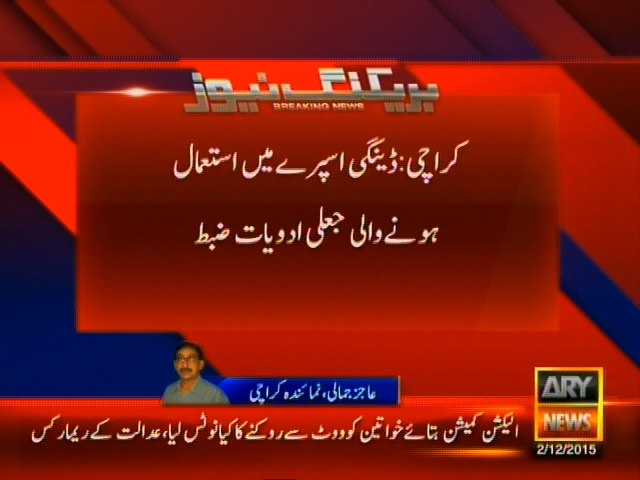 کراچی: اینٹی کرپشن کا کے ایم سی ورکشاپ پر چھاپہ، کراچی: ڈینگی اسپرے میں استمال ہونے والی جعلی ادویات صبط۔