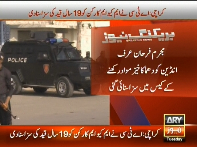 کراچی : اے ٹی سی نے ایم کیو ایم کارکن کو 19 سال قید کی سزا سنا دی، مجرم فرحان عرف انڈین کو دھماکا خیز مواد رکھنے کے کیس میں سزا سنائی گئی۔