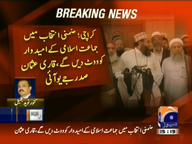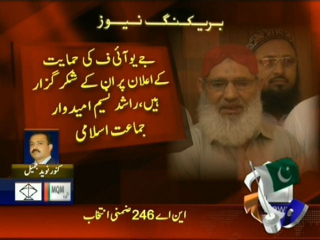 کراچی: این اے 246 ضمنی انتخاب جے یو آئی ف کا جماعت اسلامی کی حمایت کا اعلان، کراچی ضمنی انتخاب میں جماعت اسلامی کے امیدوار کو ووٹ دیں گے، جے یو آئی ف کی حمایت کے اعلان پر ان کے شکر گزار ہیں، راشد نسیم امیدوار جماعت اسلامی۔
