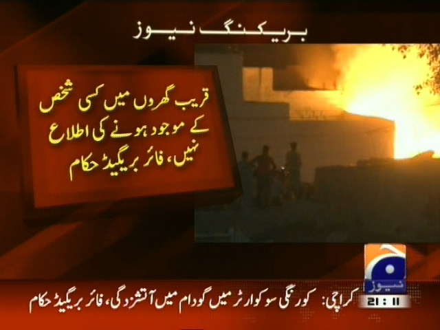 کراچی کے علاقے کورنگی سو کوارٹر میں گودام میں آگ لگ گئی، آگ کی زد میں آکر قریب واقع 4 گھر متاثر، قریب گھروں میں کسی شخص کے موجود ہونے کی اطلاع نہیں، فائر بریگیڈ حکام۔