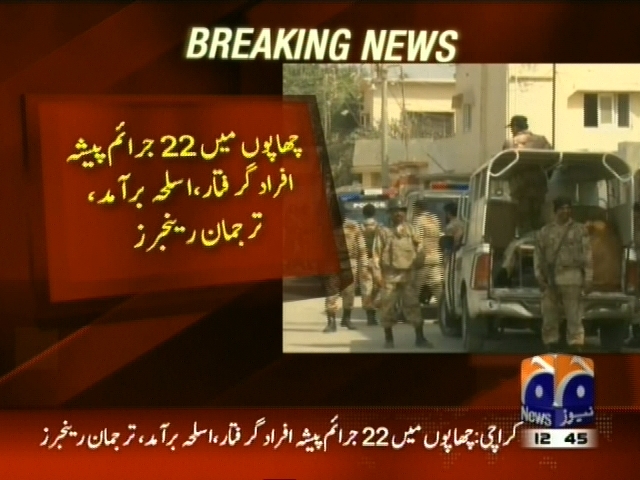 کراچی: رینجرز کی مختلف علاقوں میں کارروائیاں، چھاپوں میں 22 جرائم پیشہ افراد گرفتار، اسلحہ برآمد، ترجمان رینجرز۔